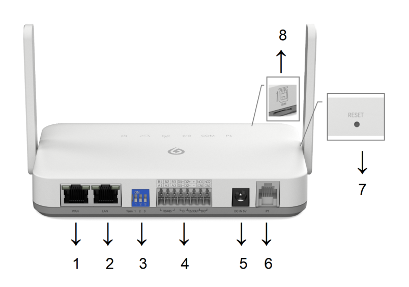 | 6 | RJ12 母座(P1)接口 | 用于连接 P1 电表。 |